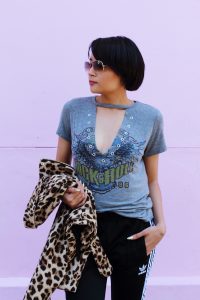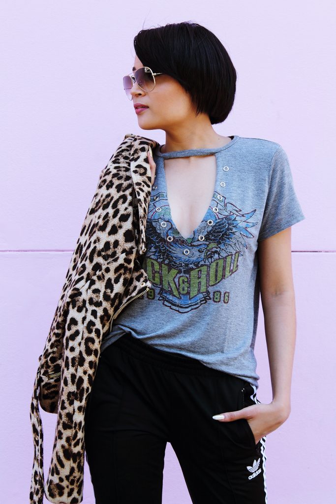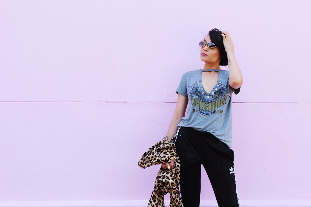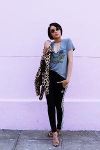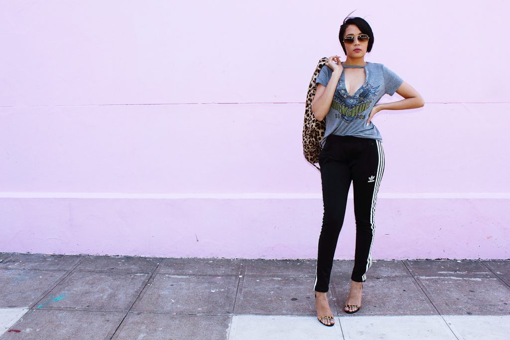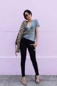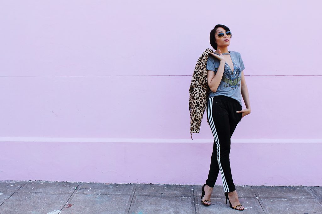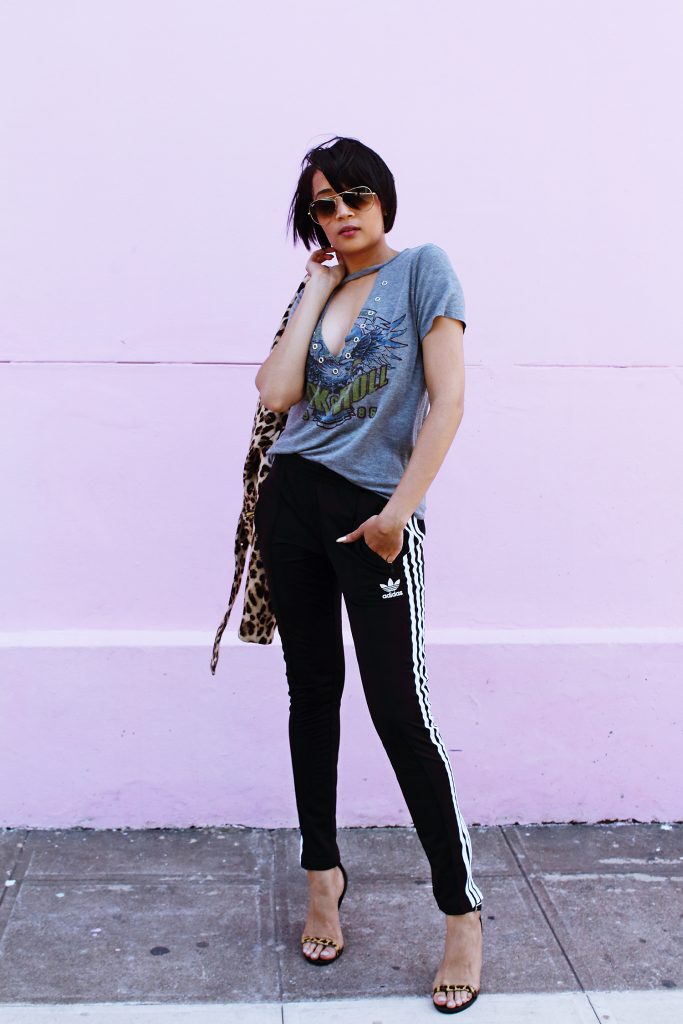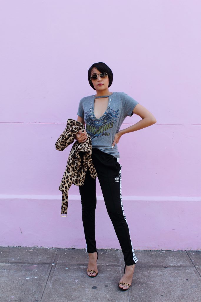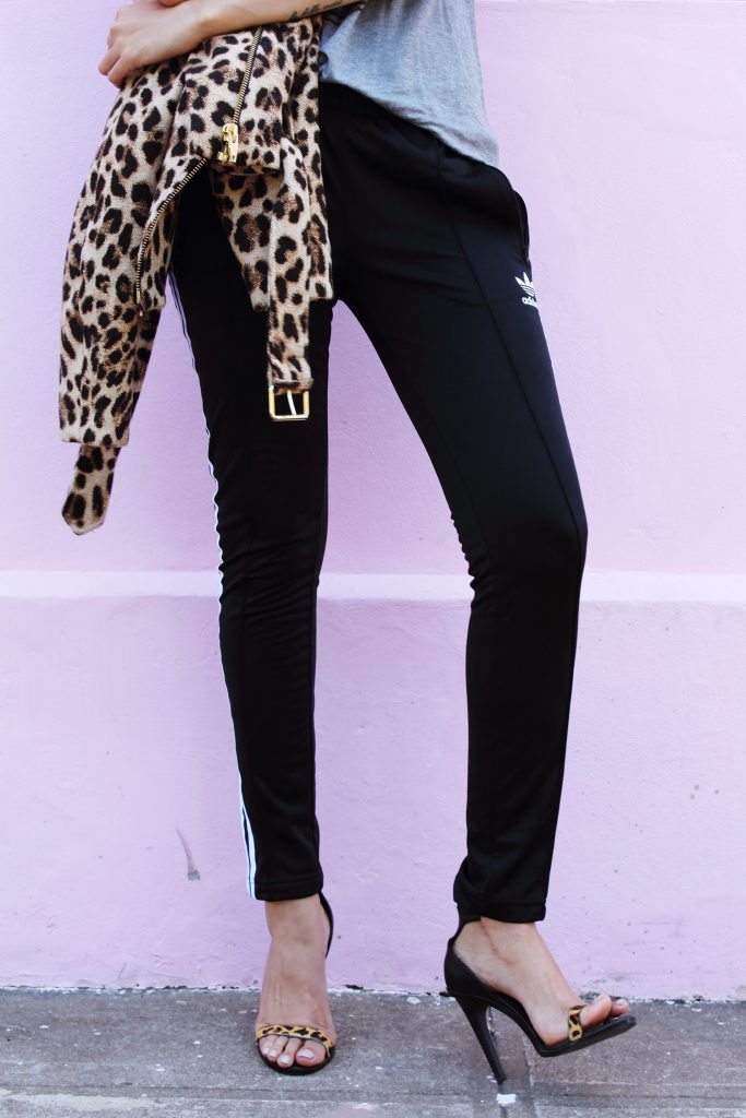 Today’s look is one I never thought I would wear. Me in track pants as a fashion look?! Say what? Here’s the thing, even though I never saw this look coming, I really have come to love it. This Adidas track pant has become one of my most worn items. I kinda love how I styled it with the leopard print accents via my jacket & heels.