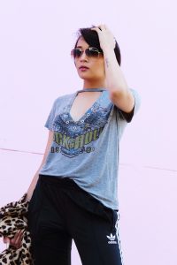 Black Adidas track pant | Heels & Jacket (ZARA) | Grey Tee (NYC) | Ray Ban Aviators