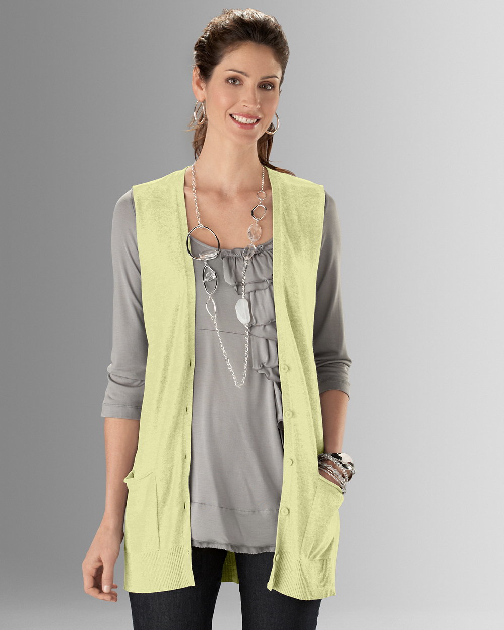 Add a sleeveless sweater to tights and a long-sleeved shirt in the same shade — but only if the sleeveless sweater is at least thigh length. Cute boots or heels, a scarf and and some earrings complete the look. Try to find accessories that complement your sweater.