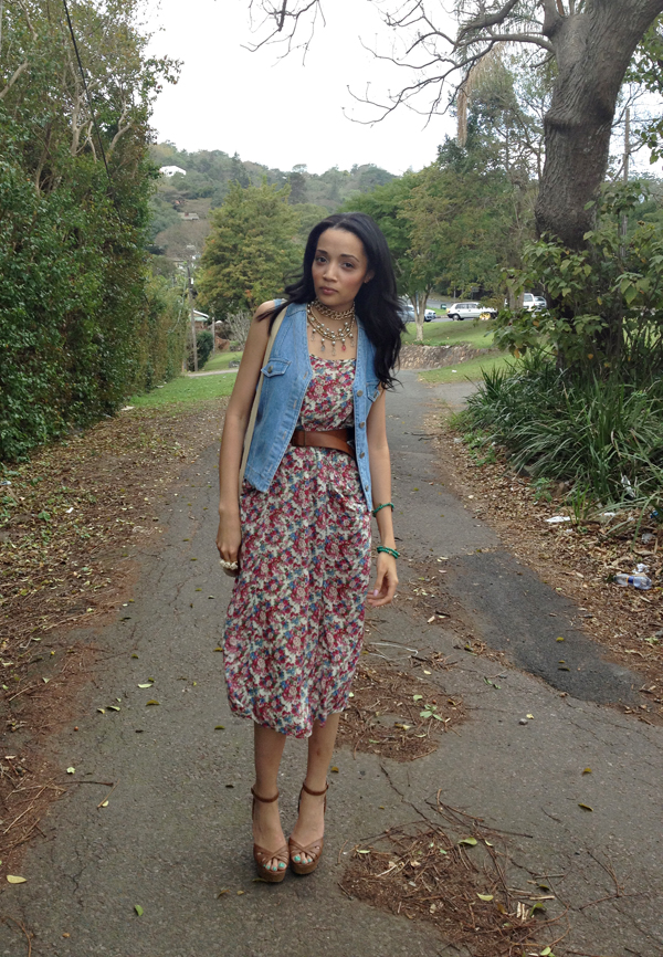 Floral Dress (YDE) | Vintage Denim Vest | Vintage Chain Belt/necklace | Bracelet & Ring (Sass Diva) | Belt & Bag (Mr Price) | Wedges (Aldo)