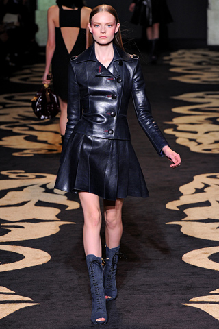 This collection was simple and strong. I love the single, boldly coloured detail in the form of flowers, or vines situated on the back of a black shift. And the midnight leather jacket, not forgetting the matching box-pleated skirt. The evening wear was spectacular. I think the final glittering silver column dress, with the trail of white marabou was absolute perfection.