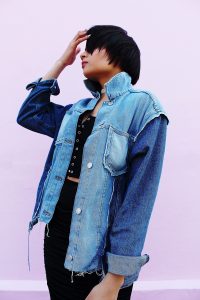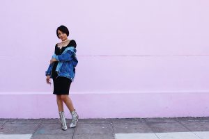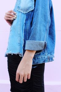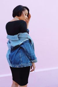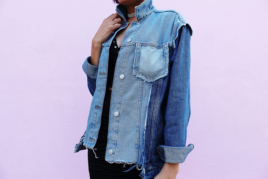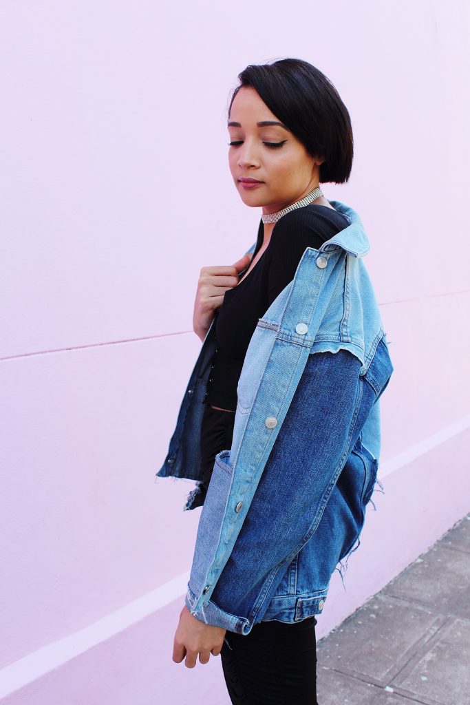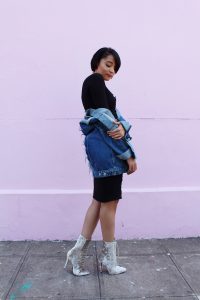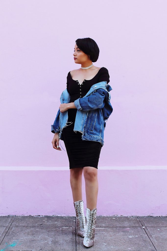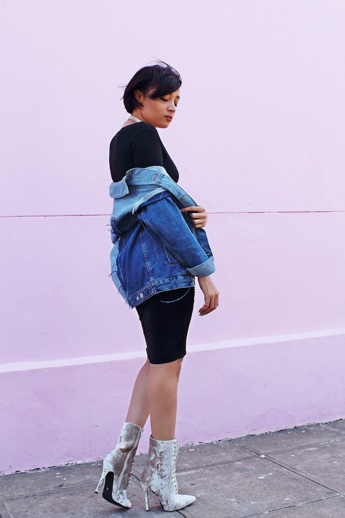 An elegant grunge girl! Love this oversized denim jacket worn atop black dress. The booties are simply WOW!
