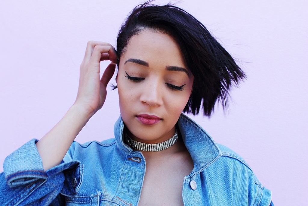 Denim MOTO Jacket (Topshop) | Black Ruched Skirt (Brett Robson buy here & here) | Diamante Choker (Shop Brett Robson) | Crushed Velvet Booties (Public Desire)